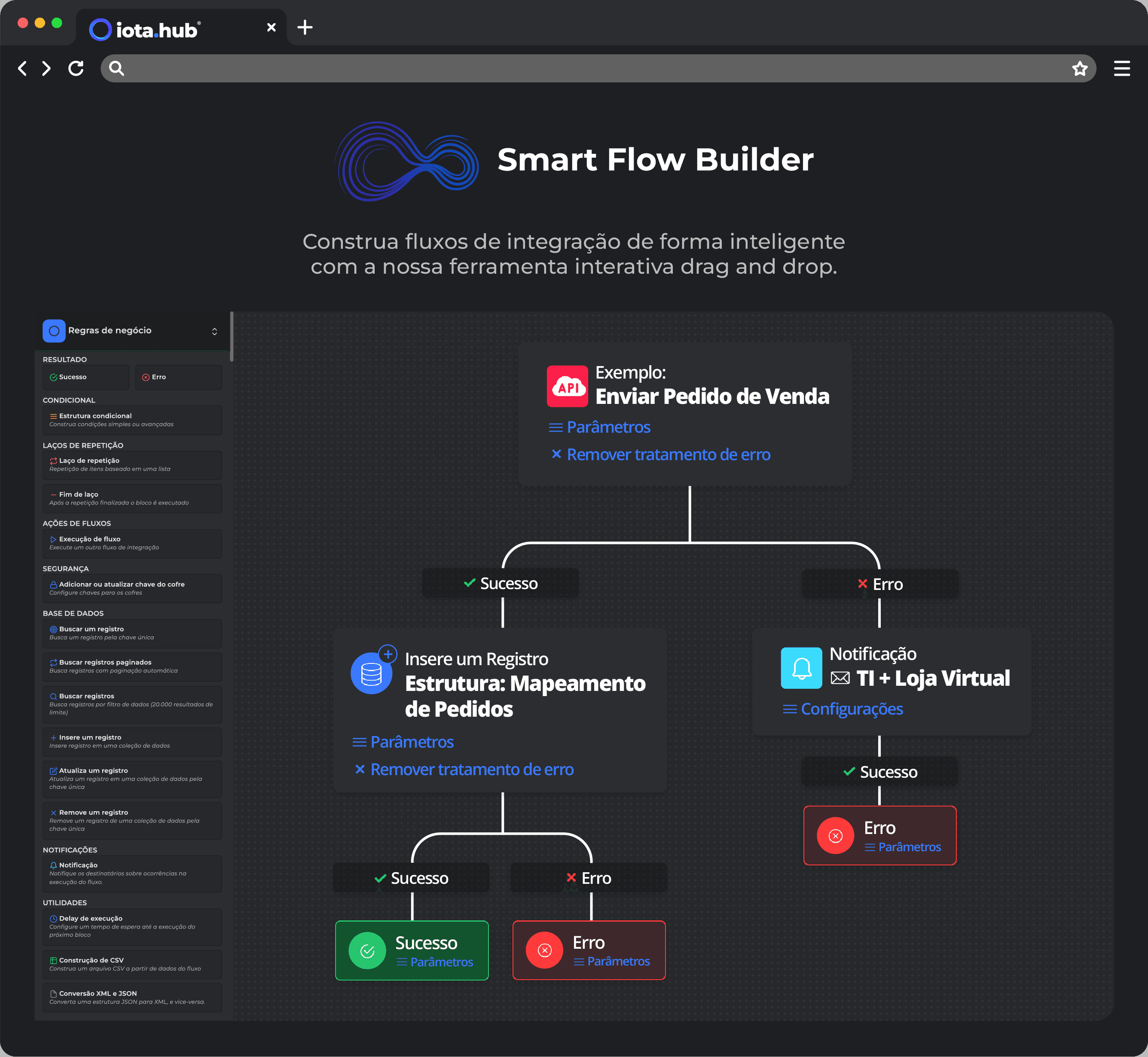 Construtor de fluxos com interface intuitiva, que acelera o processo de implementação das integrações. Logs de cada execução, monitoramento e automações.