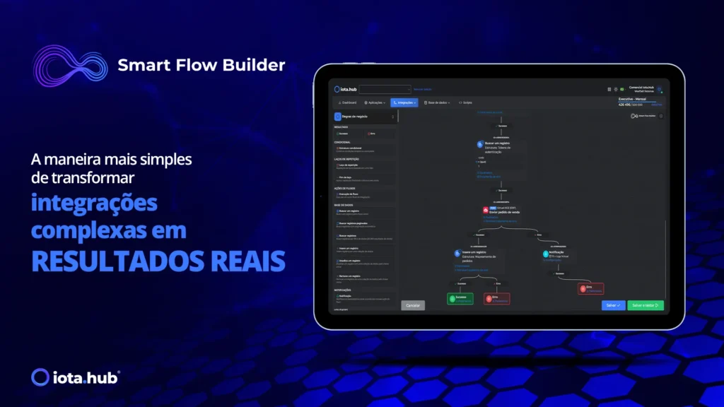 No caso do Iota.hub, essas funcionalidades ganham ainda mais força com soluções exclusivas. O Smart Flow Builder, por exemplo, permite montar integrações complexas de maneira intuitiva, sem comprometer a performance. Já o Observability Dashboard oferece uma visão 360º de todas as conexões, facilitando a gestão e a identificação de pontos críticos. E com o API Provider, é possível criar APIs públicas ou privadas com camadas de segurança avançadas — ideais para expor catálogos, preços, estoques ou regras fiscais com total controle.