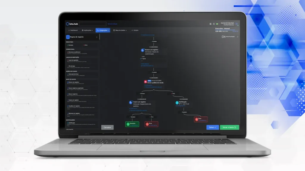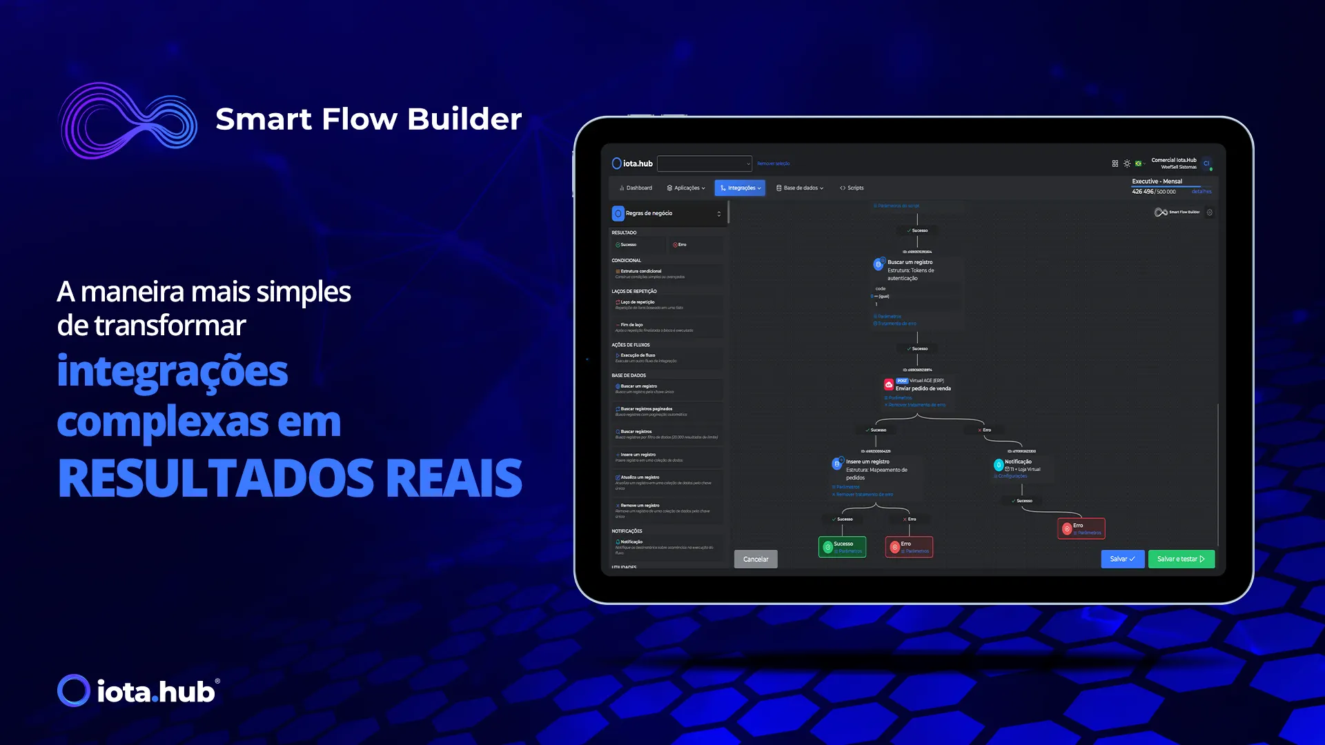Quando falamos em integrações entre sistemas, a imagem que costuma vir à cabeça é a de filas de tarefas, sprints disputando prioridade e uma camada de código que só um time consegue manter. O paradigma low‑code propõe o contrário: tornar a orquestração de dados algo acessível, visual e governável. No coração dessa proposta está o Smart Flow Builder, do Iota.hub — um ambiente em que regras de negócio e fluxos complexos deixam de ser diagramas perdidos em apresentações e passam a viver, de fato, dentro da plataforma que move sua operação.