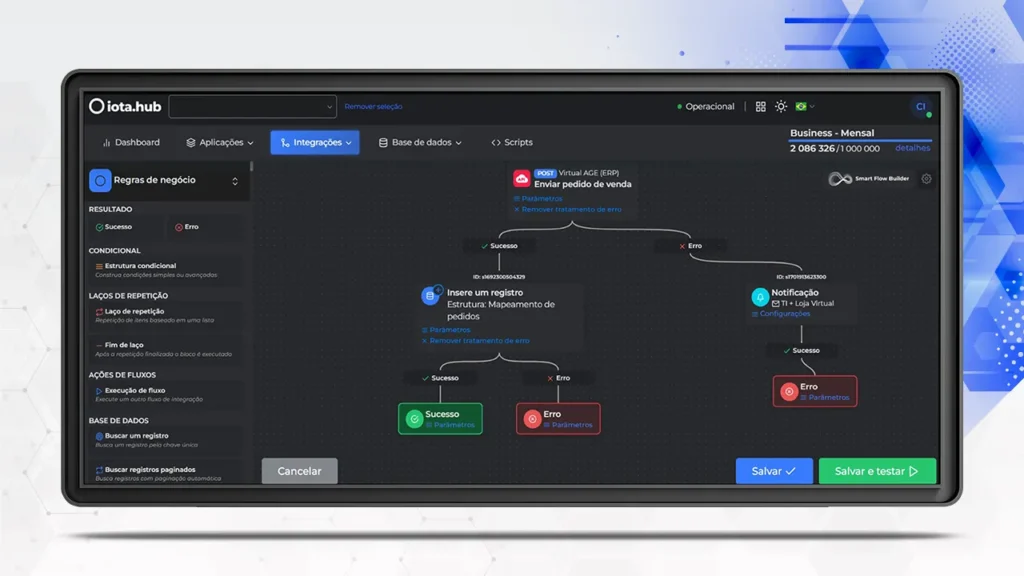 A criação dos fluxos é definida pela sua equipe e um engenheiro de integração da Iota.hub – em conjunto com a equipe de TI do cliente-, que mapeia regras de negócio, campos e dependências entre ERP, CRM, OMS, TMS e plataforma de e‑commerce. Se uma validação falhar, ele encaminha a notificação para o time correto, também é possível agendar tarefas de verificação e validação periódicas. O valor está na consistência do trânsito: cada sistema faz o que sabe fazer; o Smart Flow Builder garante que a informação certa chegue ao lugar certo, na hora certa, com trilha de auditoria.
